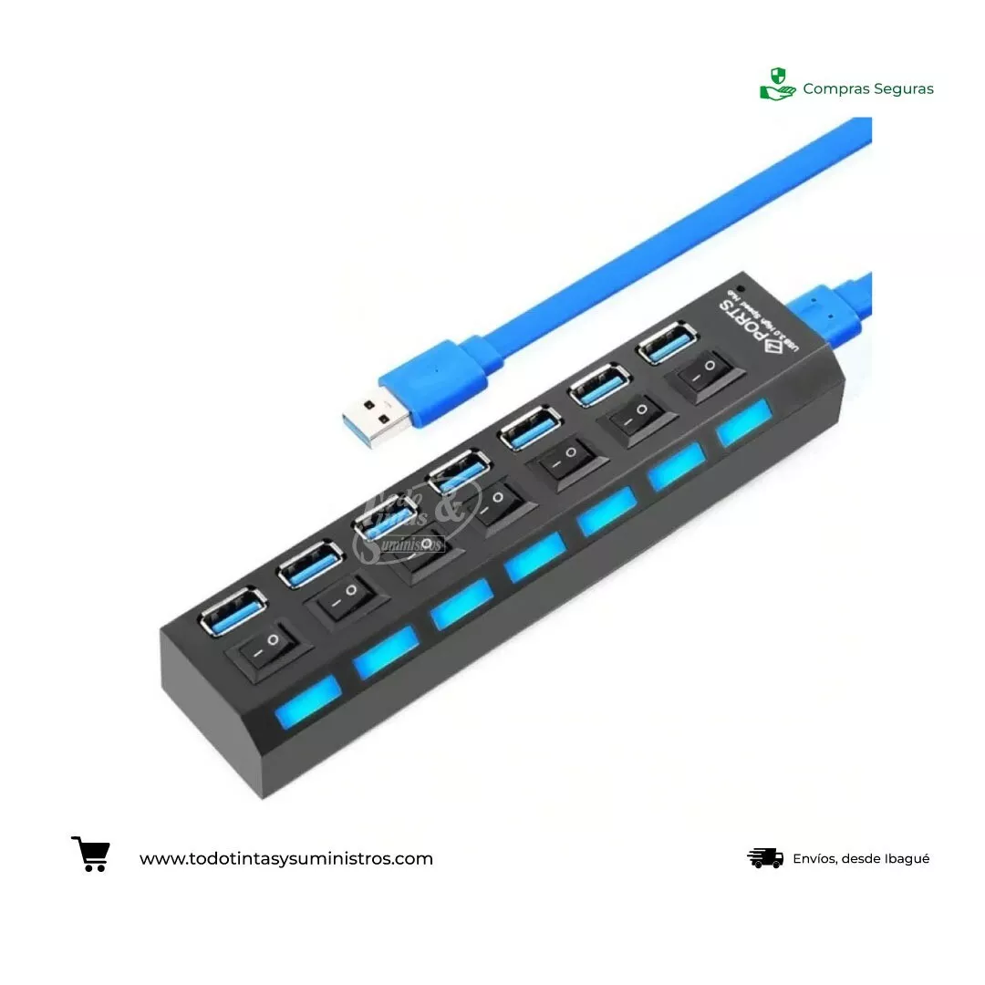 - Equipado con 7 puertos de alta velocidad, con switch de encendido individual por cada puerto.