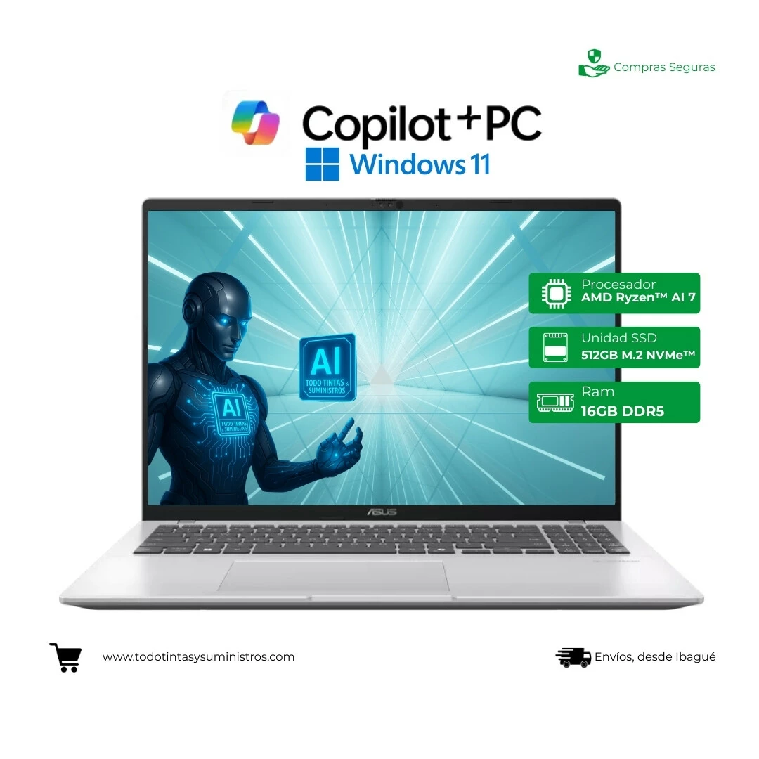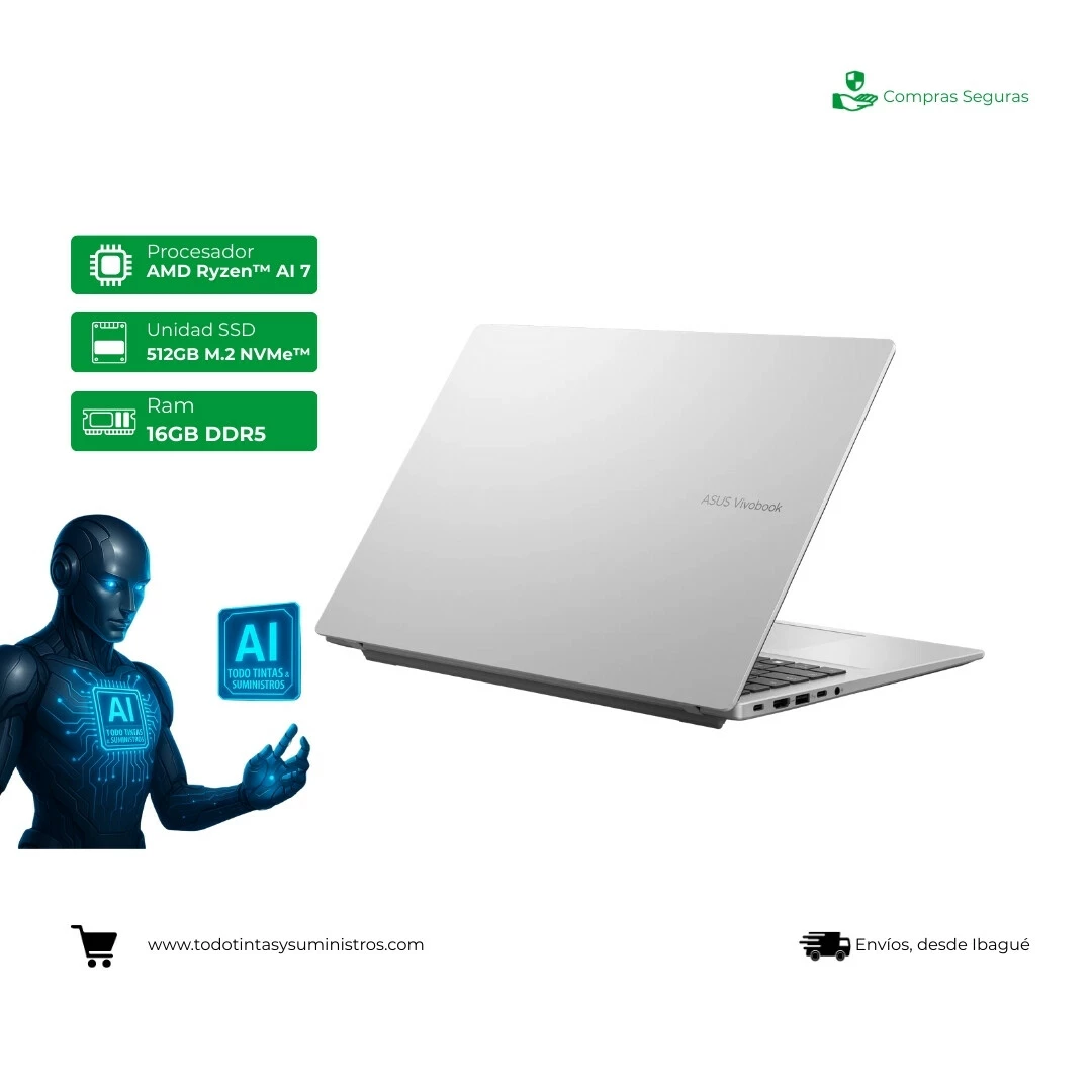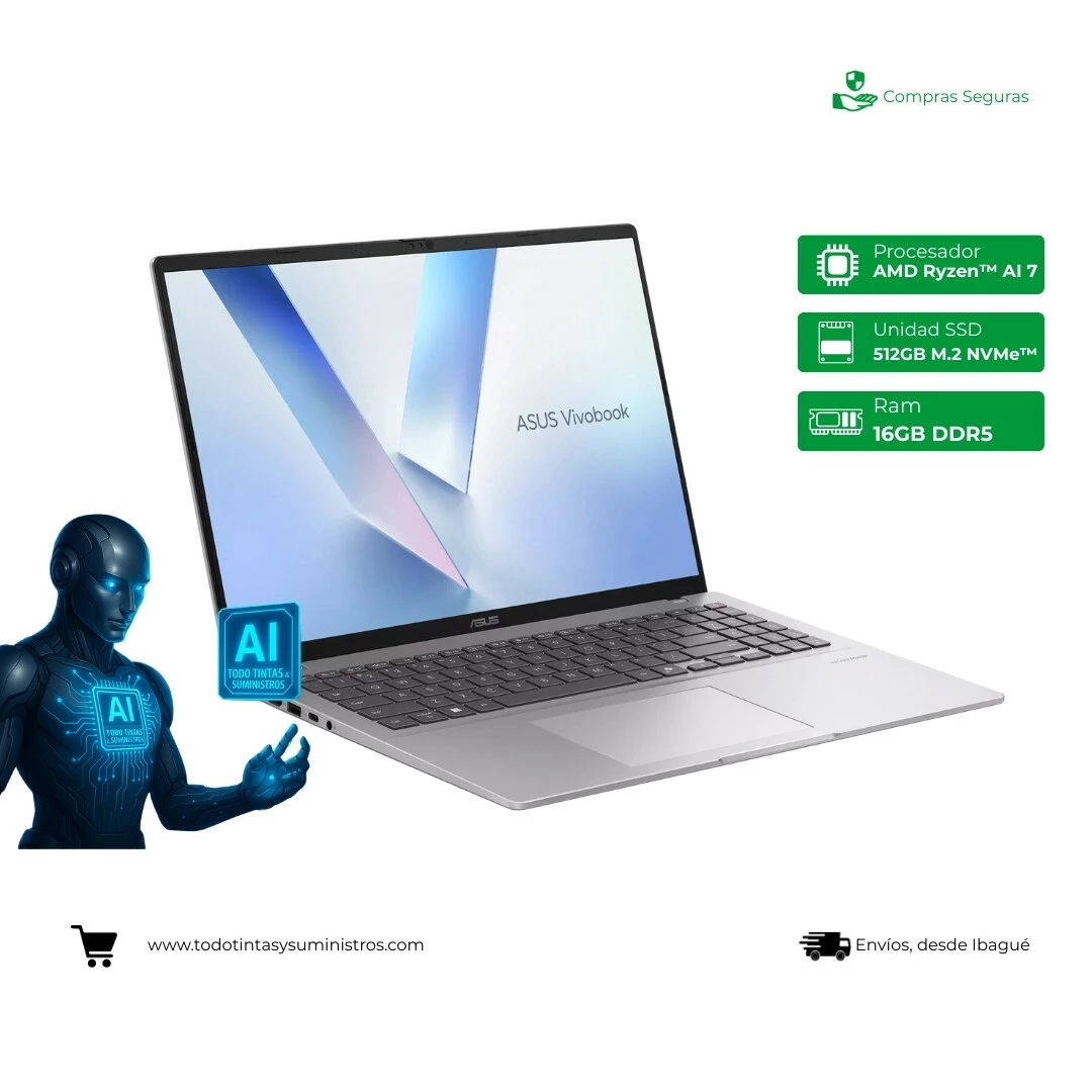 Portátil ASUS Vivobook 16" M1607KA Ryzen 7 con Inteligencia Artificial Ram 16GB Ssd 512GB + Windows 11